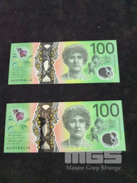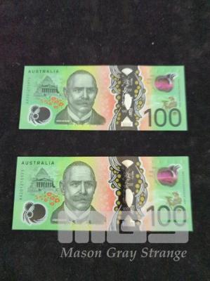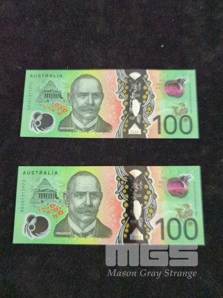 2020 AUSTRALIAN FIRST PREFIX CONSECUTIVE PAIR POLYMER $100 BANKNOTES aUNC PREFIX # AA201215972 & AA201215973
