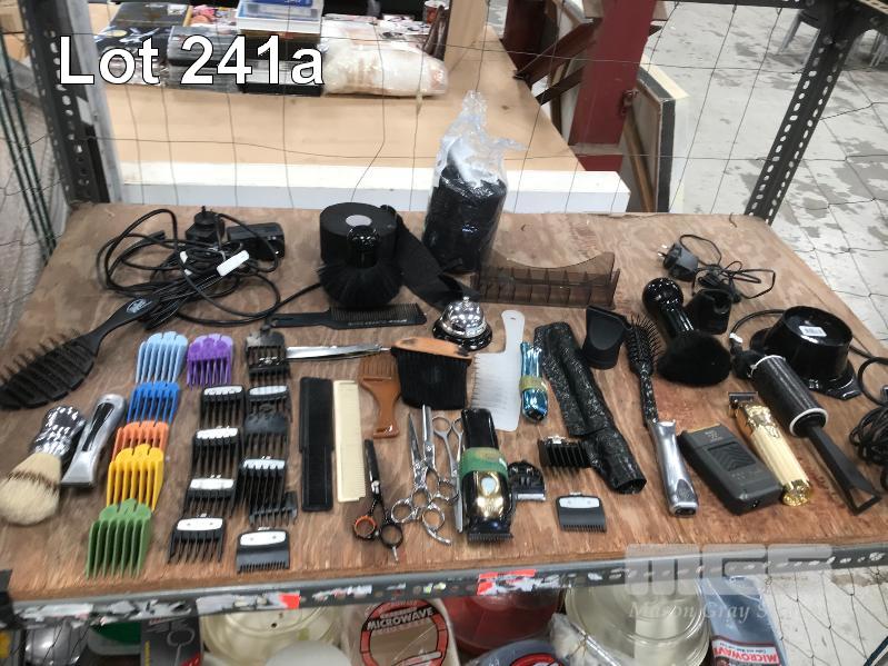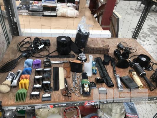 ASSORTED BARBERS ESSENTIALS, SHAVERS, SCISSORS INC THINNING SHEARS, ASSORTED SHAVER COMBS ETC