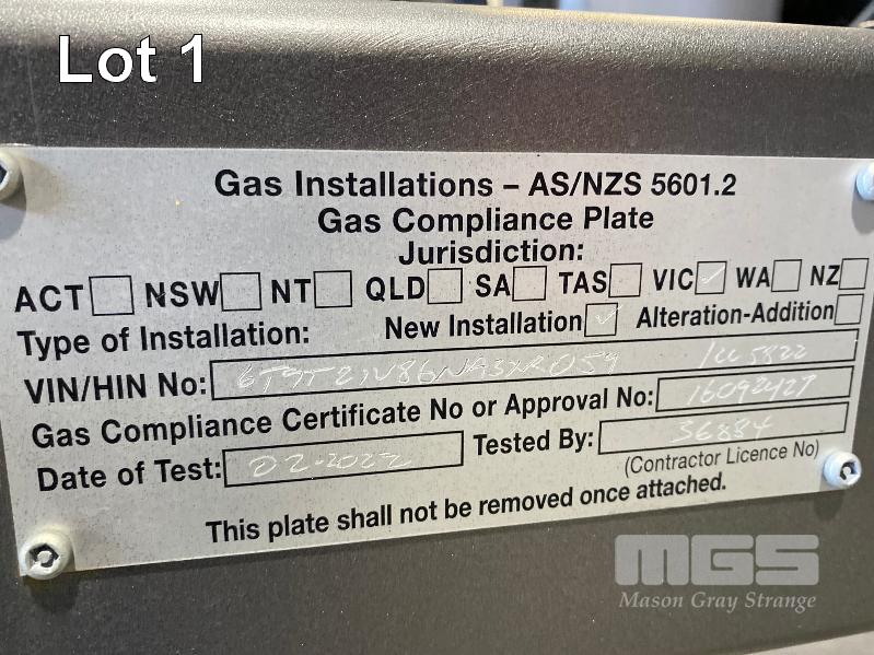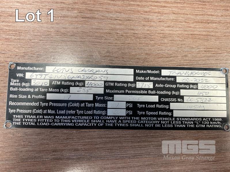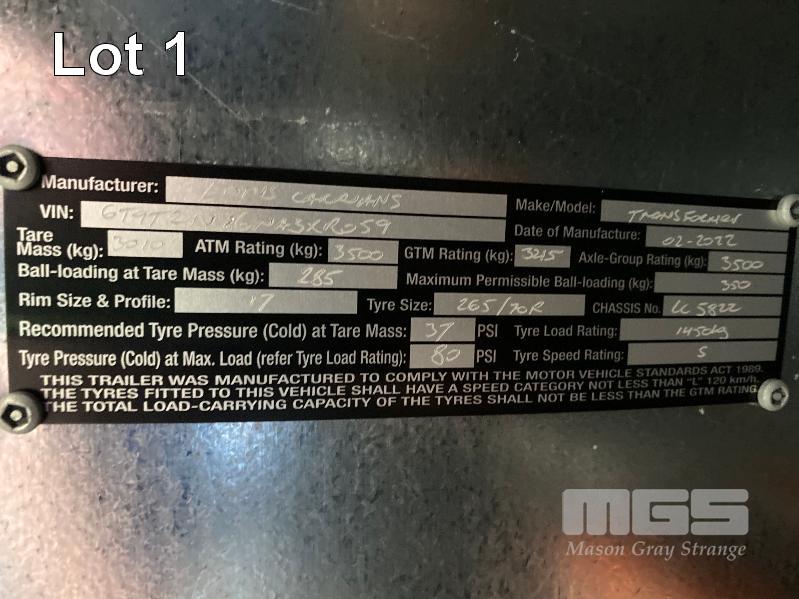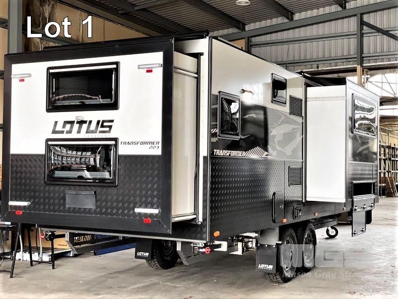2022 MODEL LOTUS TRANSFORMER 223 CARAVAN VIN 6T9T21V8NA3XR059 CHASSIS #LC5822, TARE 3010 KG, BALL 23 KG, ATM 3500-4000 KG, INTERNAL SIZE 22?3, EXTERNAL SIZE 22?3 LAY OUT, FEATURING, MASTER DOUBLE BED, SPACIOUS KITCHEN, CLUB LOUNGE & DINING AREA, SEPARATE TOILET & SHOWER AREA, EXCLUSIVE REAR KIDS ZONE WITH DOUBLE BUNKS THAT TRANSFORM TO A DAY LOUNGE. MODERN FEATURES & APPLIANCES, INCLUDING THETFORD OVEN & COOKTOP, RANGE HOOD, DOMETIC REFRIGERATOR, NOE MICROWAVE, FUSION STEREO SYSTEM & SPEAKERS, 3 X TELEVISIONS INSIDE & OUTSIDE, REVERSE CYCLE AIR CONDITIONING, MINI DESTINATION RV CLOTHES WASHING MACHINE. CHASSIS, WITH TORFLEX SUSPENSION, EXCLUSIVE RIMS WITH ECOVISION 2/70/17 TYRES, DRUM BRAKES, ALLOY ENTRY STEP, COUPLING & HEAVY-DUTY CHAINS. ELECTRICAL, B TEC 200 AH LITHIUM BATTERY, 3 x 170 W SOLAR PANELS, REDARC 30 A BATTERY CHARGER, AWNING LIGHTS, WORK LIGHT TO FRONT, INTERNAL DOWNLIGHTS, INTERNAL USB POINTS, WATER LEVEL GUAGES TO TANKS, REVERSING CAMERA, WINEGARD HD SENSOR TELEVISION ANTENNA, EXTERNAL ENTERTAINMENT PACK, EXPLORER PLUG, PUSH BUTTON RESETTABLE FUSE PANEL. PLUMBING, 2 x WATER TANKS, ENDLESS HWS, FILTER TAP, TAP ON FRAME, GAS BAYONET, 2 x GAS CYLINDERS. EXTERIOR, EURO STYLE DOUBLE GLAZED TINTED WINDOWS, TOOL BOX ON A FRAME, CHEQUER PLATE BODY ARMOUR TO SIDES, MESH STONE GUARD PROTECTOR, 3A GERMAN MARINE GRADE COMPOSITE PANEL, POWER HATCH ABOVE TOILET, PRESSURE HATCH, DOMETIC MANUAL AWNING, PICNIC TABLE.