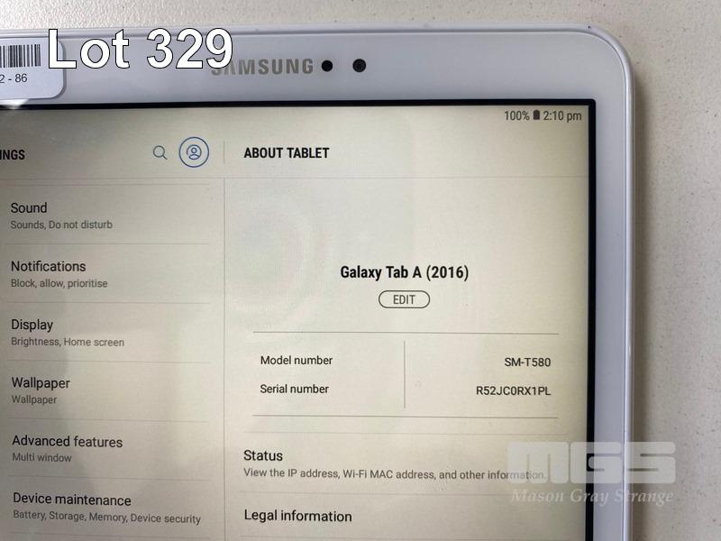 TABLET PC, SAMSUNG GALAXY TAB A, MODEL SM-T580, 16GB, Wi-Fi, 10.1" SCREEN (NO CABLE, NO CHARGER) S/N:R52JC0RX1PL