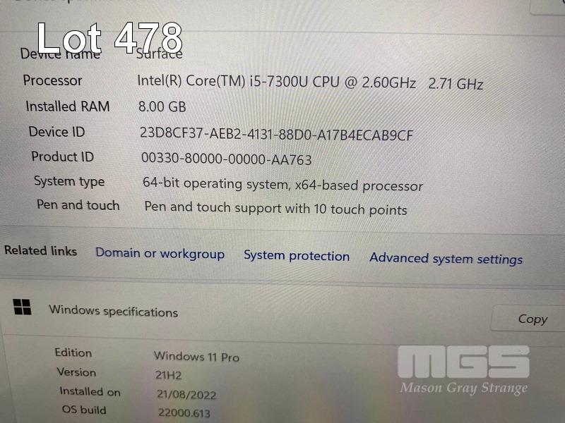 TABLET PC, MICROSOFT SURFACE PRO (5TH GEN), MODEL 1796, CORE i5 7300U (7TH GEN) @ 2.6GHz, 8GB RAM, 256GB NVMe M.2 SSD, 12.3" TOUCHSCREEN (2736x1824), Wi-Fi, BLUETOOTH, WINDOWS 11 PRO INSTALLED, KEYBOARD TYPE COVER & POWER SUPPLY S/N:026052674653