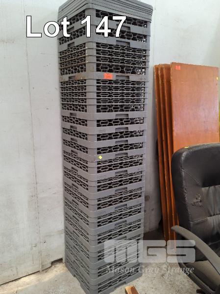 15 X NSF CERTIFIED 25-COMPARTMENT DISHWASHER GLASS TRAYS WITH EXTENDERS. IN GREY. 7 X LIDS. 500 X 500 MM.