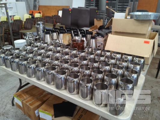 HOTEL BREAKFAST SERVICE. INCLUDES 60 (APPROX.) X HYPERLUX MILK/WATER JUGS, 20 (APPROX.) KINOX AROMIS INSULATED THERMAL SERVERS (NO LIDS), URNS, STRAW DISPENSER ETC (2 X TABLES).