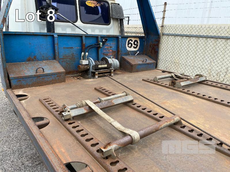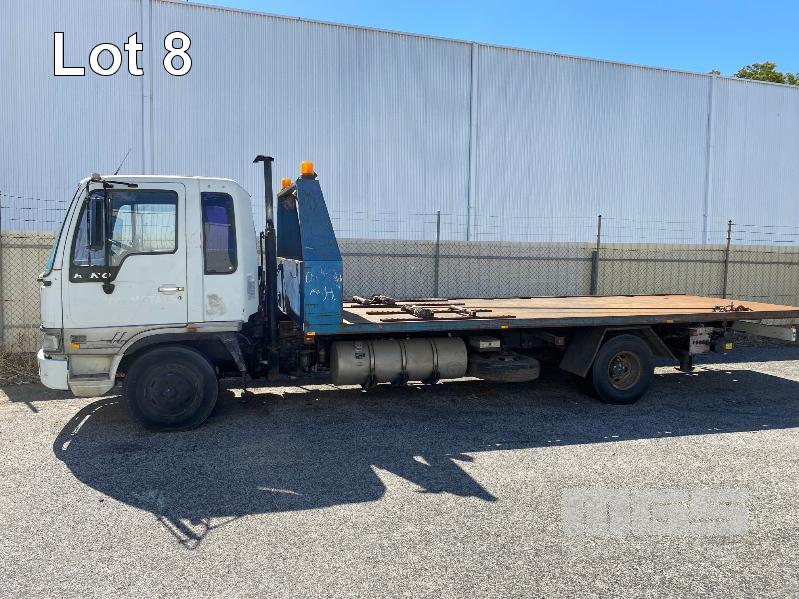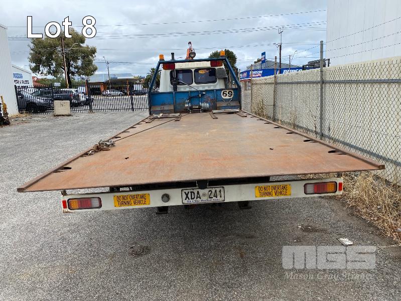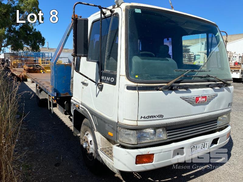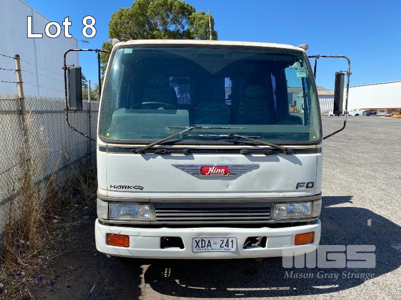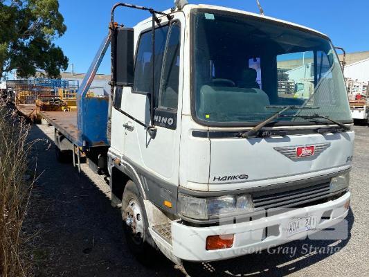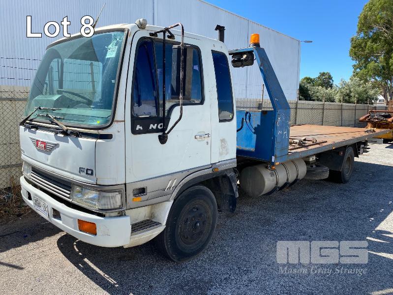 1994 HINO FD HAWK FD3W 4 x 2 SINGLE CAB SLIDING TILT TRAY REG: XDA 247 (SA) VIN: JHDFD3WLLXXX10286 ENG: W06EE27266 ODO: 623,520 kms SHOWING GVM: 9,800kg GCM: 14000 HINO, 6 CYLINDER DIESEL, 6 SPEED MANUAL, WHITE DUCO, 2 DOORS, 2 SEAT, AIR CON, HYDRAULICS, STEEL TRAY, TRAY SIZE 6550 x 2480mm TYRES 8.25 R16 CT (AVERAGE) FITTED WITH HYDRAULIC WINCH, COMEUP MOD: HV-15, 6.8T HAZARD LIGHTS & BEACONS SPARE WHEEL KEY #31 (WITH PAPERS, WITH 1 KEY/S, NO OWNER'S MANUAL, NO SERVICE BOOKS)