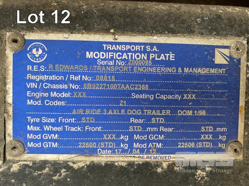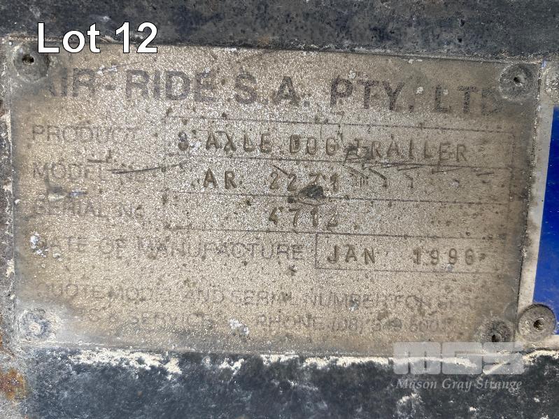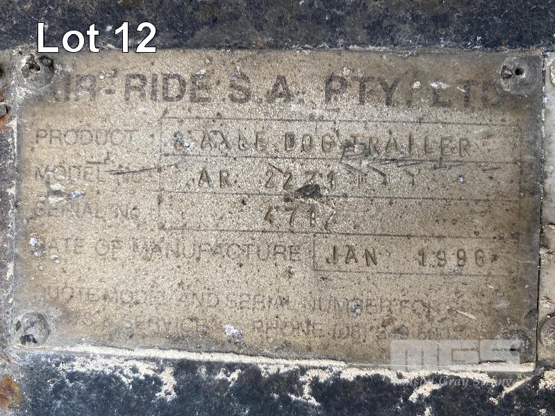 1996 AIR RIDE 20FT TRIAXLE DOG SEMI TRAILER MODEL: AR 2271 REG: YAG 729 VIN / CHASSIS: 6B9227100TAAC2368 HUBOMETER: 17,529 kms SHOWING ATM: 22,500 kg AIRBAG SUSPENSION, SPIDER RIMS, DRUM BRAKES, RING FEEDER, TYRES 11R 22.5 (IN GOOD CONDITION ) SPARE WHEEL HINGED SIDES BODY SIZE: 6400 x 2400mm (WITH PAPERS)