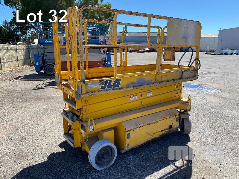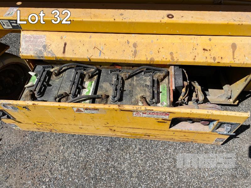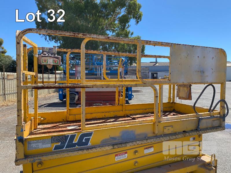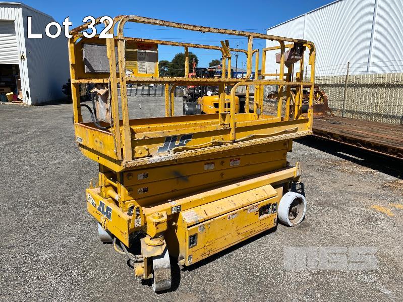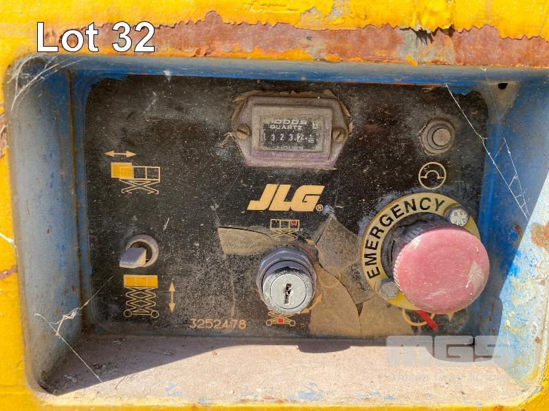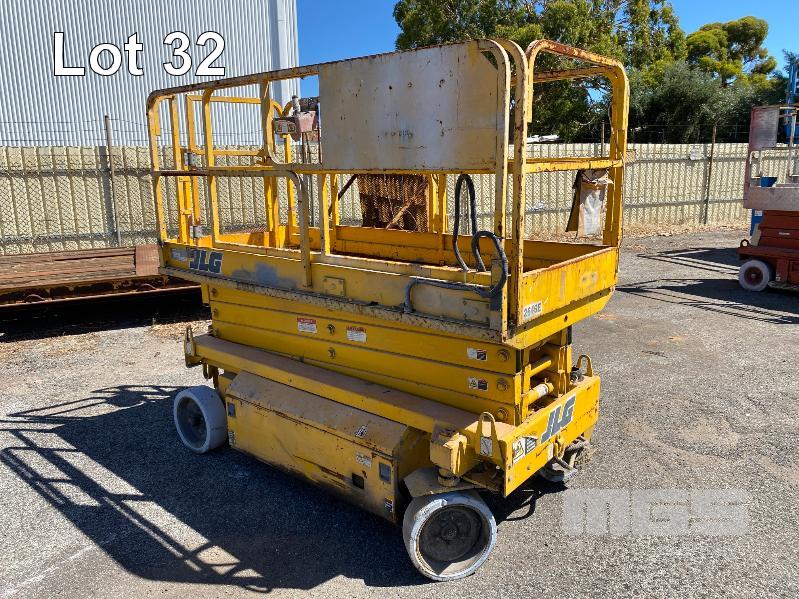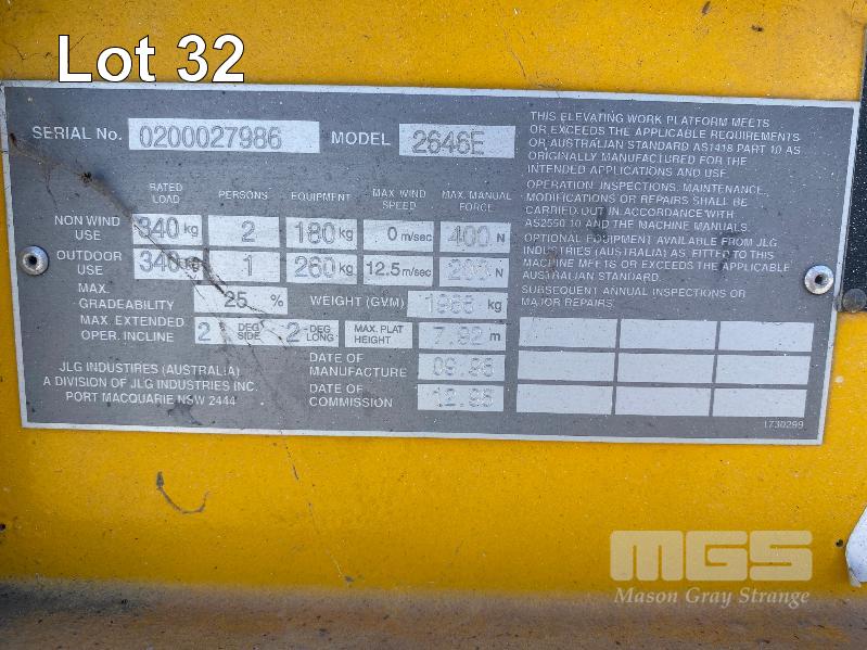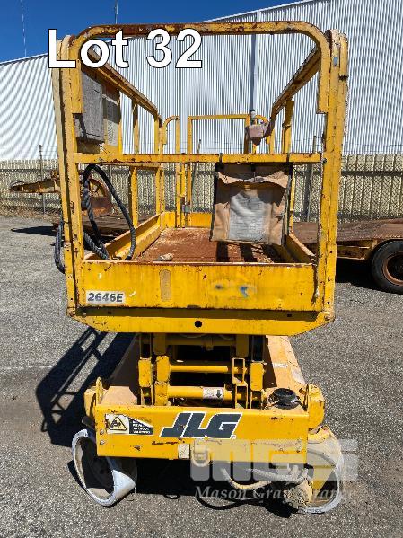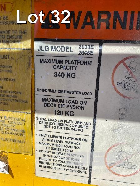 SCISSOR LIFT, JLG MOD: 2646E SERIAL: 0200027986 DOM: 09/1996 HOURS: 1323 SHOWING ELECTRIC MAX LOAD CAP 340kg MAX HEIGHT 7,920mm 2 PERSON CAP MAX LAST INSPECTION DATE 18/05/2015 (WAS 10 YEAR MAJOR) CONDITION UNKNOWN NO KEY, BATTERIES NOT HOLDING CHARGE