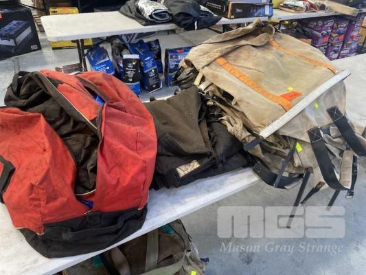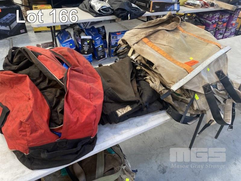 16 x CANVAS FRUIT PICKING BAGS, 3 x APRONS, BAGS & TARP