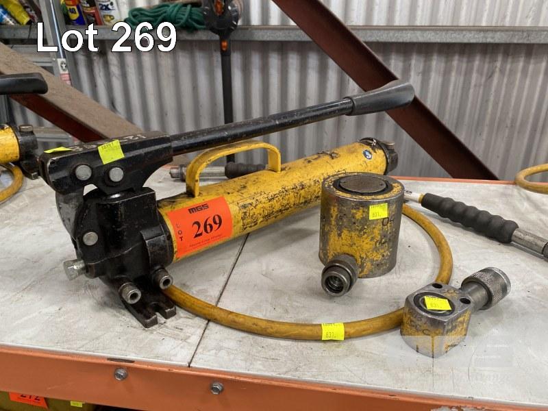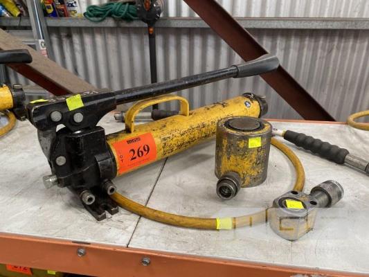 ENERPAC HYDRAULIC HAND PUMP & HOSE WITH 2 x HYDRAULIC RAMS