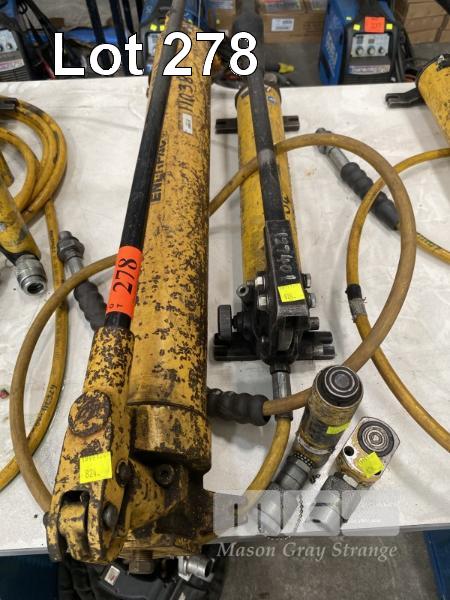 2 x ENERPAC HYDRAULIC HAND PUMPS, LARGE & MEDIUM, 750 & 450mm (L) WITH HOSES & 2 x HYDRAULIC RAMS
