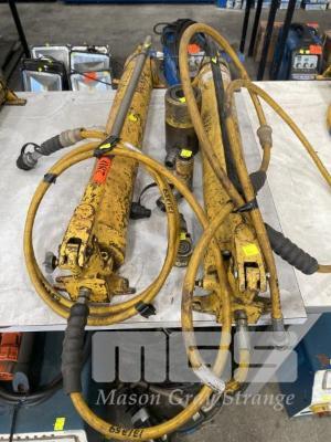 2 x ENERPAC HYDRAULIC HAND PUMPS, 750mm (L) WITH HOSES & 3 x HYDRAULIC RAMS