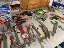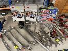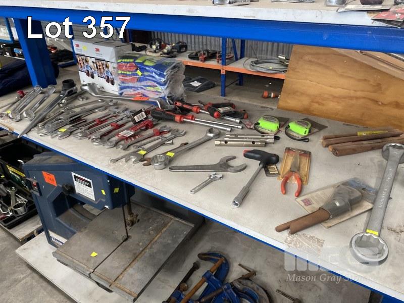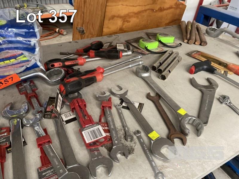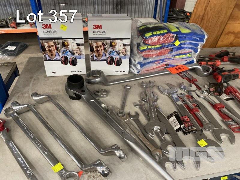 QUANTITY ASSORTED HAND TOOLS, SIDCHROME, ETC INC OPEN END & RING SPANNERS, 41 TO 6mm, HEX DRIVERS, PIPE WRENCH, RATCHET SPANNER, 36mm, TAPE MEASURES, 10 x PAIRS HIGH VIS RIGGERS GLOVES & 2 x 3m PELTOR HELMET EAR MUFFS 1 x SHELF