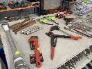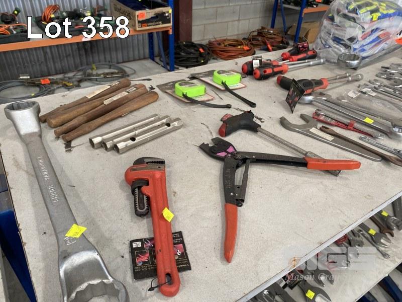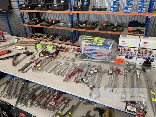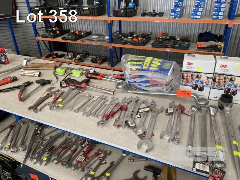 QUANTITY ASSORTED HAND TOOLS, SIDCHROME, ETC INC OPEN END & RING SPANNERS, 41 TO 6mm, HEX DRIVERS, PIPE WRENCH, RATCHET SPANNER, 36mm, TAPE MEASURES, 10 x PAIRS HIGH VIS RIGGERS GLOVES & 2 x 3m PELTOR HELMET EAR MUFFS 1 x SHELF