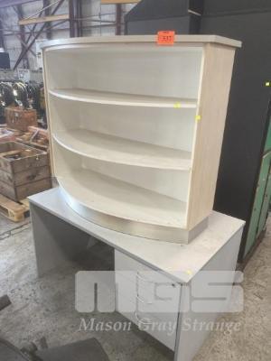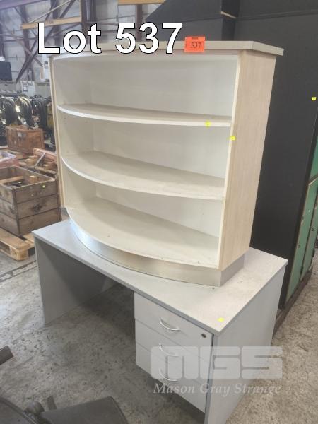 3 DRAWER GREY LAMINATE DESK, 135 (L) x 75cm (W) WITH 3 TIER BOOKCASE, 100 (H) x 120cm (W)
