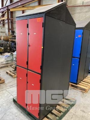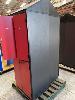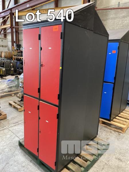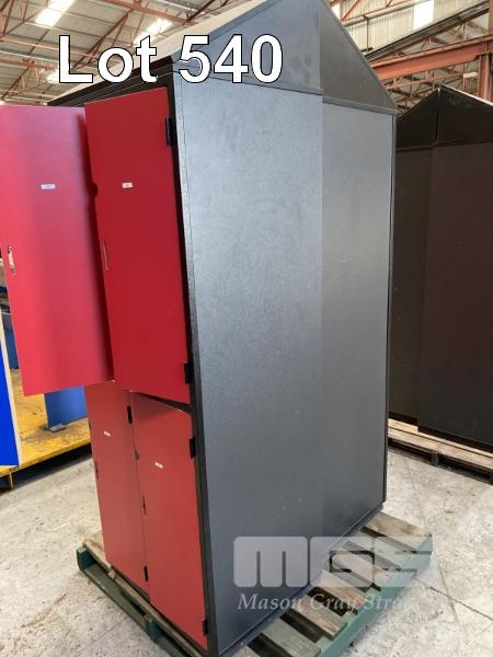 2 x 4 DOOR LOCKERS, METAL FRAME FRONT, BLACK LAMINATE WITH RED LAMINATE DOORS INDIVIDUAL LOCKER OUTSIDE MEASUREMENT: 185 (H) x 72 (W) x 58cm (L) INDIVIDUAL LOCKER INSIDE MEASUREMENT: 86 (H) x 32 (W) x 52cm (D) SINGLE SHELF
