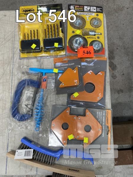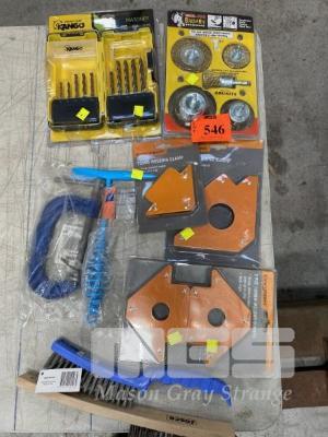 WIRE BRUSH SET, DRILL BIT SET, 3 x MAGNETIC WELDING CLAMPS, G-CLAMP, HAND WIRE BRUSHES & WELDING HAMMER, (NEW)