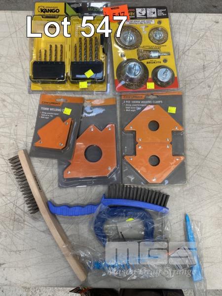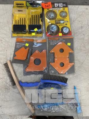 WIRE BRUSH SET, DRILL BIT SET, 3 x MAGNETIC WELDING CLAMPS, G-CLAMP, HAND WIRE BRUSHES & WELDING HAMMER, (NEW)