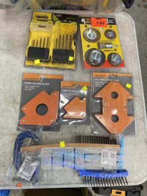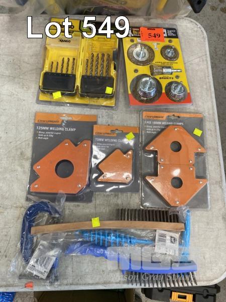 WIRE BRUSH SET, DRILL BIT SET, 3 x MAGNETIC WELDING CLAMPS, G-CLAMP, HAND WIRE BRUSHES & WELDING HAMMER, (NEW)