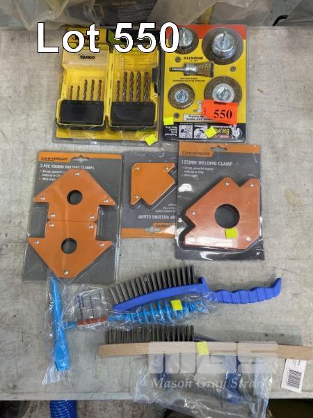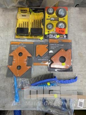 WIRE BRUSH SET, DRILL BIT SET, 3 x MAGNETIC WELDING CLAMPS, G-CLAMP, HAND WIRE BRUSHES & WELDING HAMMER, (NEW)