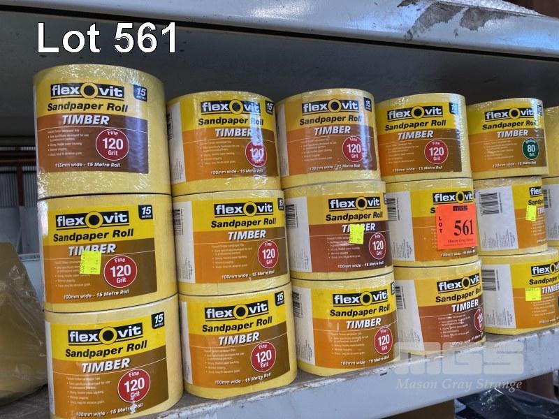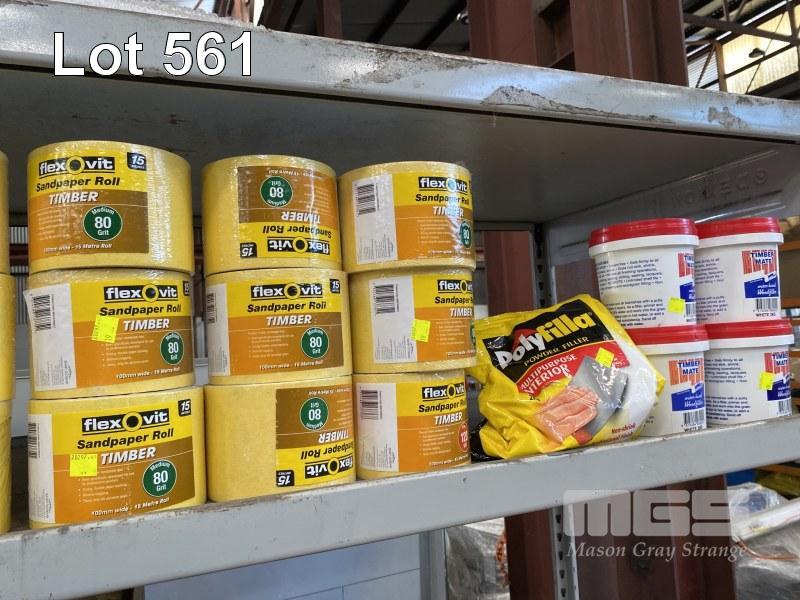 4 x TUBS TIMBER MATE WOOD FILLER, POLYFILLA, 3 x POLY FLOATS, 320mm & SANDPAPER ROLLS, FLEXOVIT 120 GRIT, 13 x ROLLS, 100mm x 15m & FLEXOVIT 80 GRIT, 8 x ROLLS 100mm x 15m (ALL NEW)