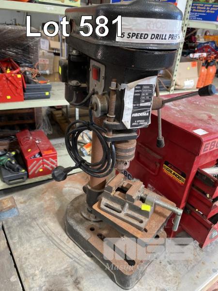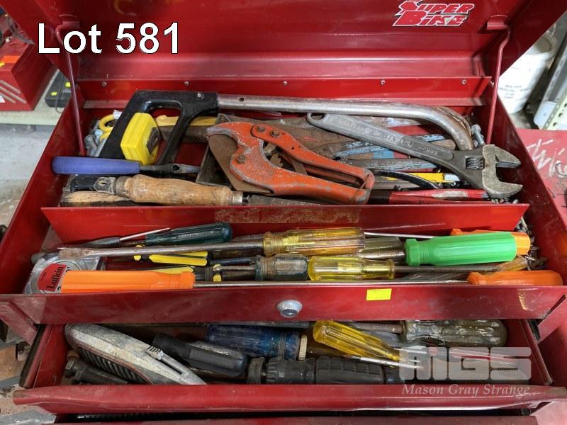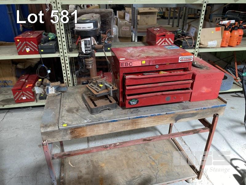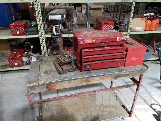 2 x TOOL BOXES & CONTENTS ASSORTED HAND TOOLS RYOBI BENCH DRLL PRESS & WORKSHOP TROLLEY