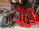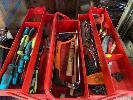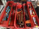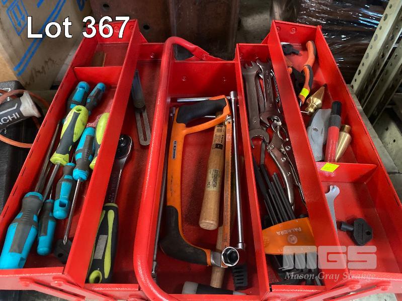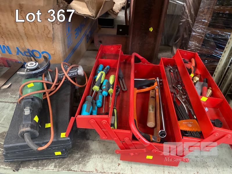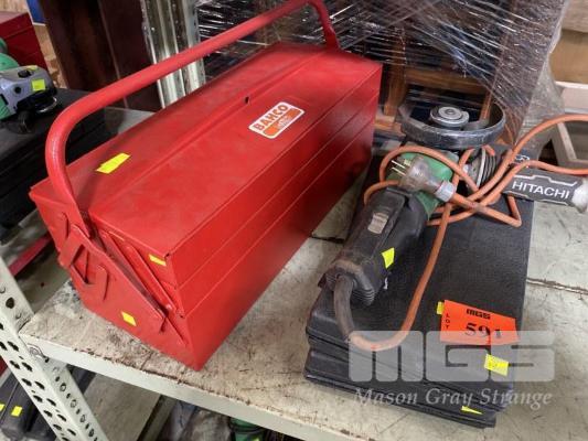 TOOL BOX & ASSORTED HAND TOOLS INCLUDING PLIERS, HACKSAW, SOCKET SPANNER, HAMMER, 2 x STANLEY SCREWDRIVER SETS & HITACHI G13SER ANGLE GRINDER, 125mm, 240V