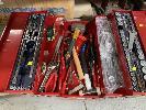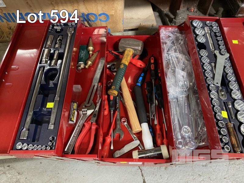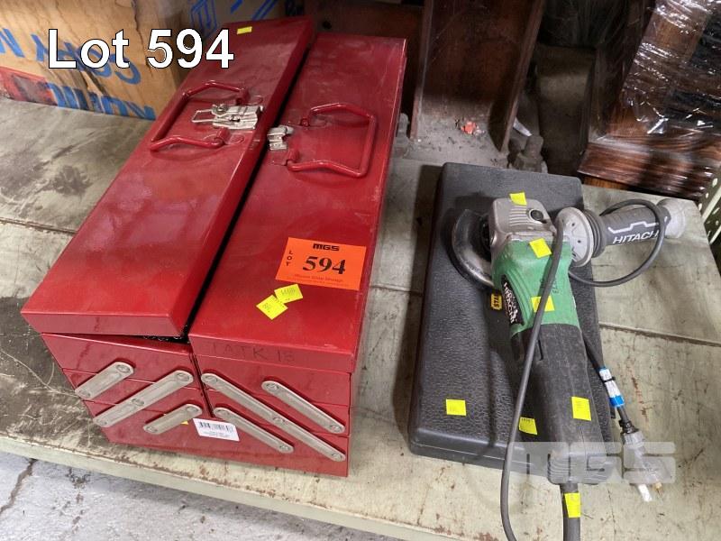 JBS TOOL BOX & ASSORTED HAND TOOLS INCLUDING SOCKET SET, SPANNERS, HAMMERS, 1 x STANLEY SCREWDRIVER SET & HITACHI G13SER ANGLE GRINDER, 125mm, 240V