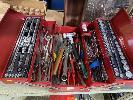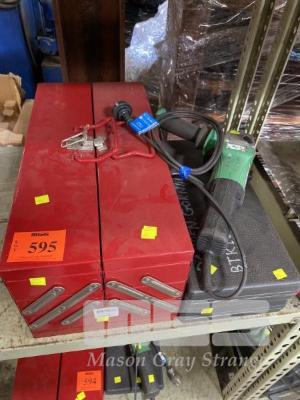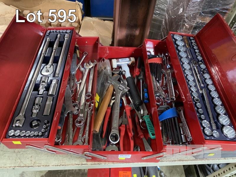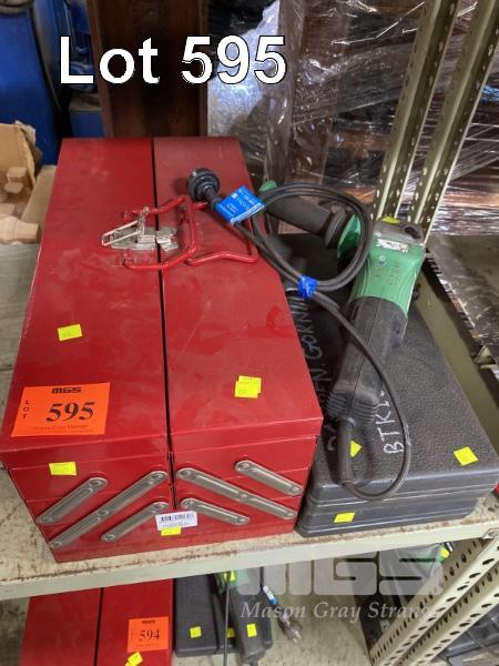 JBS TOOL BOX & ASSORTED HAND TOOLS INCLUDING SOCKET SET, SPANNERS, VICE GRIPS, HAMMERS, 2 x STANLEY SCREWDRIVER SETS & HITACHI G13SER ANGLE GRINDER, 125mm, 240V