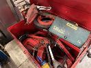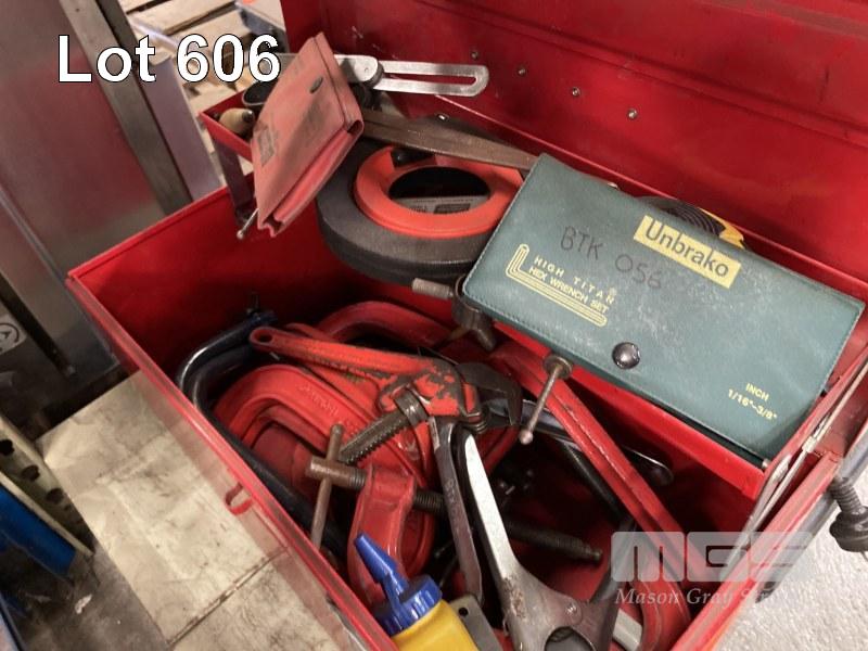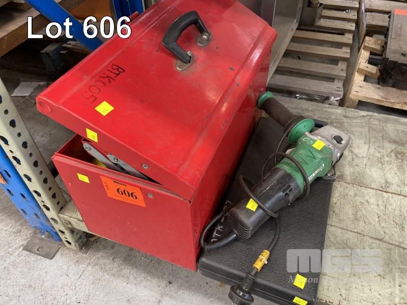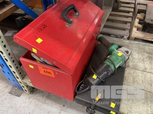 JBS TOOL BOX & ASSORTED HAND TOOLS INCLUDING CLAMPS, HACKSAWS, MEASURING TAPES, PLUM BOBS, WRENCHES, SCREWDRIVER SET & HITACHI G13SER ANGLE GRINDER, 125mm, 240V
