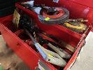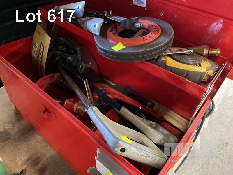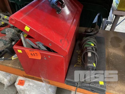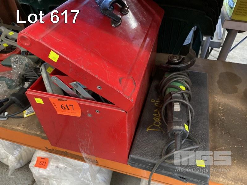 JBS TOOL BOX & ASSORTED HAND TOOLS INCLUDING CLAMPS, HACKSAWS, MEASURING TAPES, PLUM BOBS, WRENCHES, SCREWDRIVER SET & HITACHI G13SER ANGLE GRINDER, 125mm, 240V