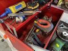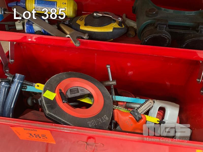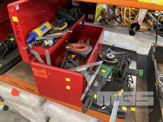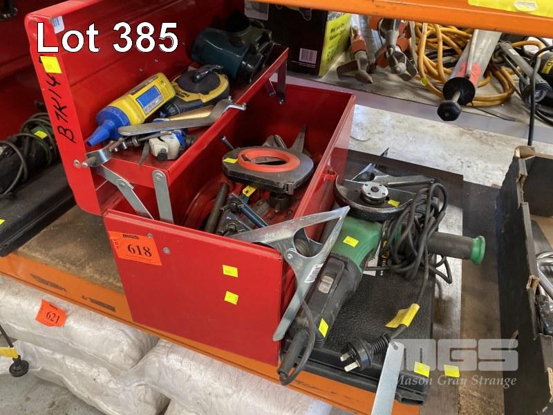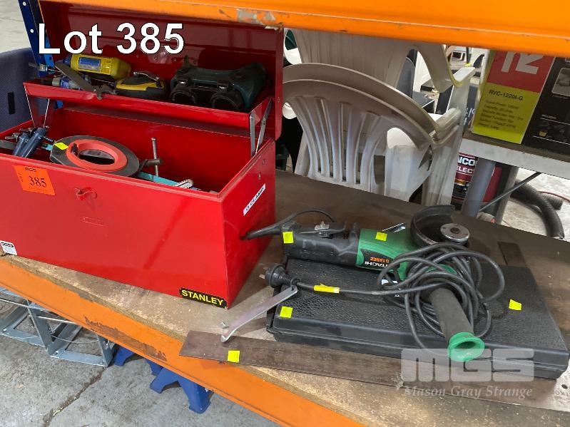 JBS TOOL BOX & ASSORTED HAND TOOLS INCLUDING CLAMPS, HACKSAWS, MEASURING TAPES, PLUM BOBS, WRENCHES, SCREWDRIVER SET & HITACHI G13SER ANGLE GRINDER, 125mm, 240V