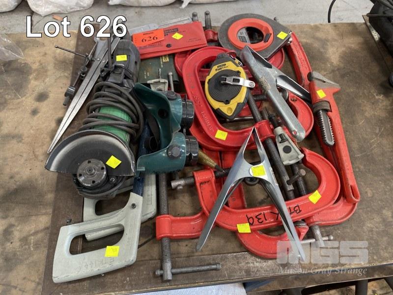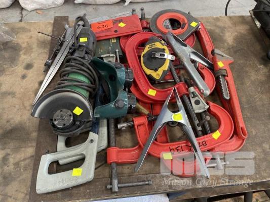 ASSORTED HAND TOOLS INCLUDING 8 x 150mm G-CLAMPS, HEX WRENCH SETS, 2 x SET SQUARES, HACKSAWS, PROTRACTORS & HITACHI G13SE2 ANGLE GRINDER, 125mm, 240V