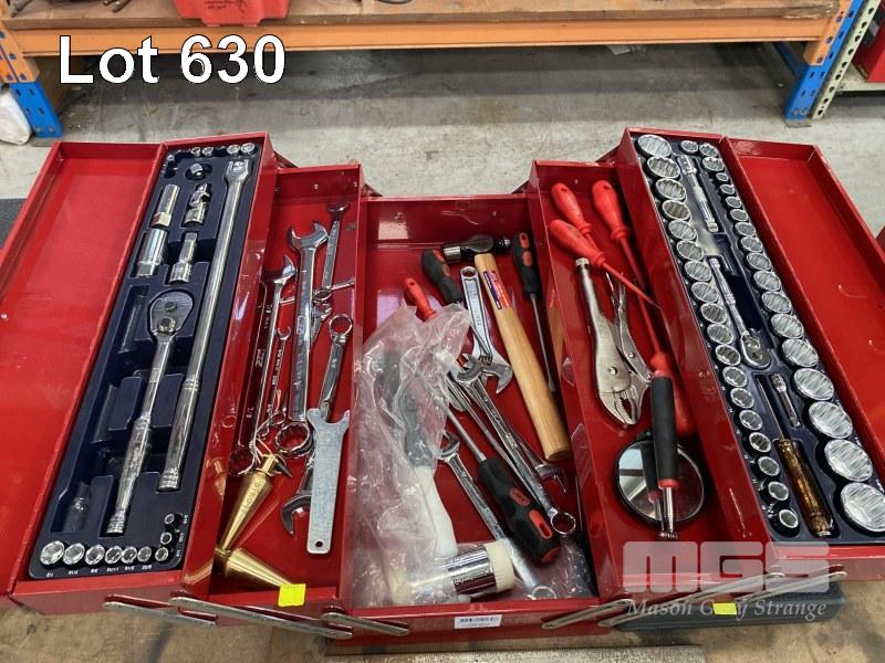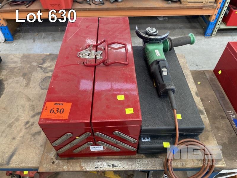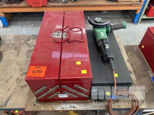 JBS TOOL BOX & ASSORTED HAND TOOLS INCLUDING SOCKET SET, SPANNERS, VICE GRIPS, HAMMERS, 2 x STANLEY SCREWDRIVER SETS & HITACHI G13SER ANGLE GRINDER, 125mm, 240V