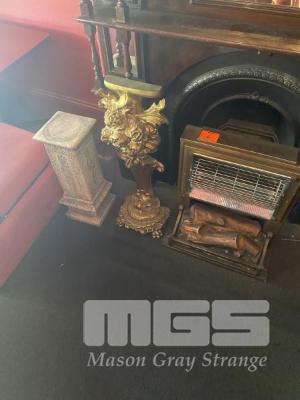 ELECTRIC HEATER, PLINTH & GOLD PAINTED ROSE DECORATIVE STATUE