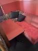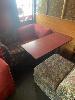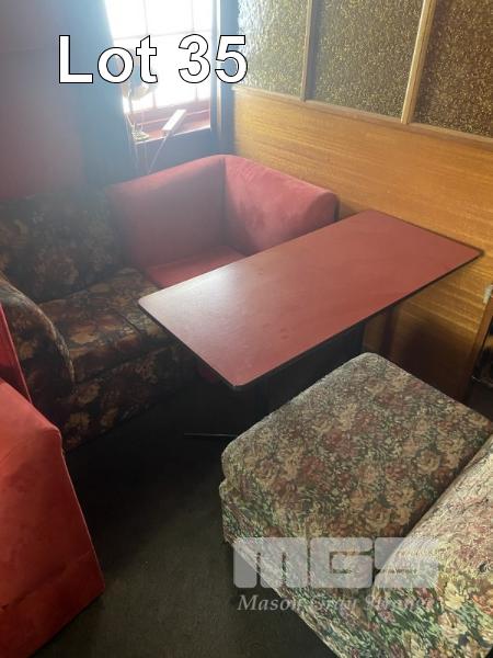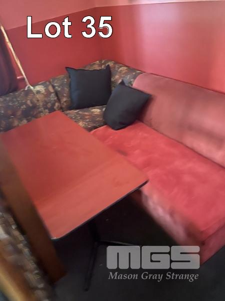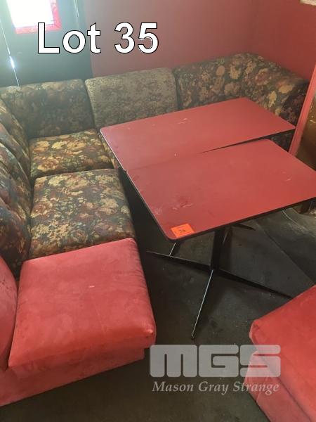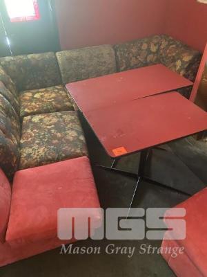 5 x CAFE LAMINATE TABLES & 12 x ASSORTED RED FABRIC SOFAS