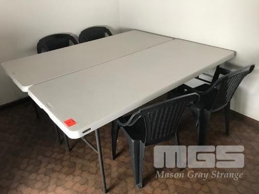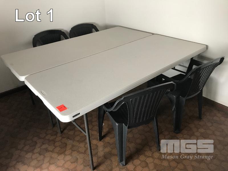 2 x BLOW MOULD TRESTLE TABLES & 4 x OUTDOOR STACKABLE CHAIRS