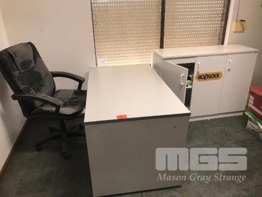 GREY OFFICE DESK, WHITE 3 DOOR STORAGE CABINET & 2 DRAWER STEEL