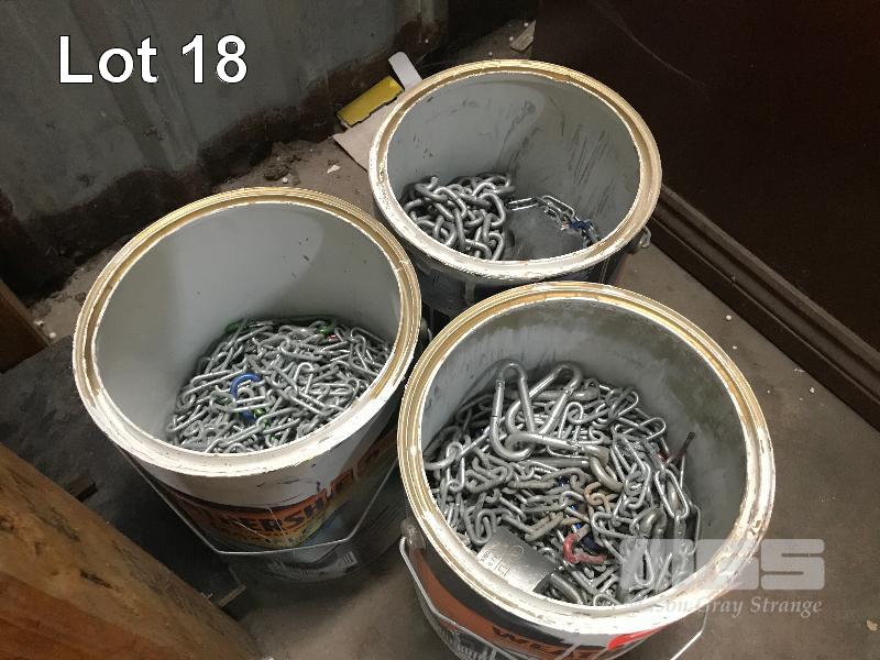 3 x PAINT CANS & CONTENTS ASSORTED LENGTHS CHAIN & CARABINERS