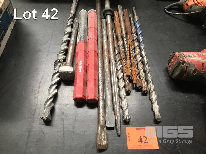 ASSORTED HAMMER DRILL ATTACHMENTS, MASONRY DRILLS, CHIPPING SPADE, SPIKES, ETC