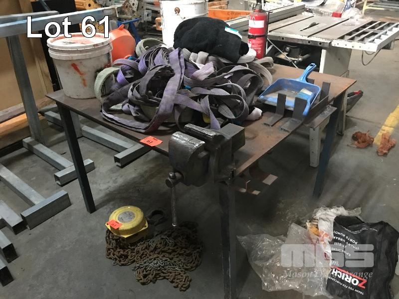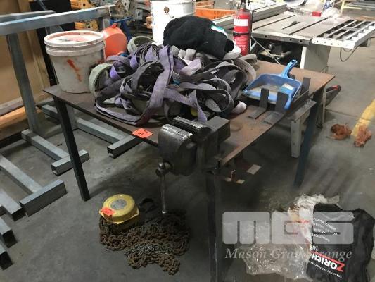 STEEL HEAVY DUTY WELDERS BENCH APPROX 1.2 x 1.3m FITTED WITH ASSORTED STEEL JIGS & RECORD VICE