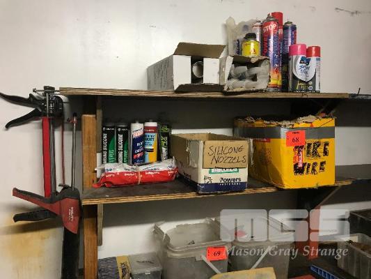 ASSORTED SILICONES, EXPANDING FOAM, DYE MARK PAINT, TIE WIRE, CAULKING GUN, ETC