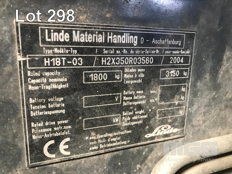2004 LINDE H18T-03 1.8 TONNE FORKLIFT VIN: H2X350R03560 LPG, RED, (NO PAPERS, NO OWNER'S MANUAL, NO SERVICE BOOKS)