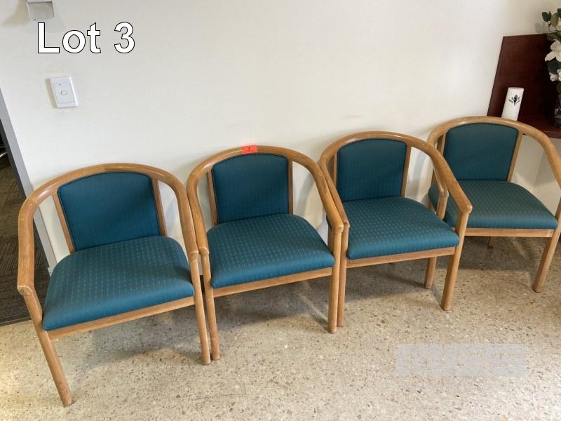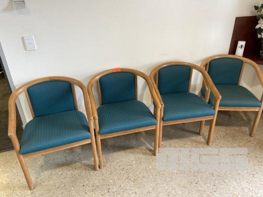 4 x VISITOR CHAIRS, TIMBER & GREEN CLOTH