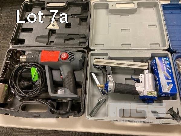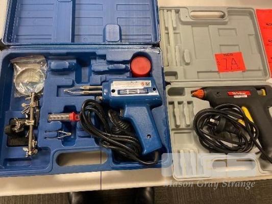 OZITO HEAT GUN IN CASE, SPEAR & JACKSON PNEUMATIC STAPLE GUN IN CASE, SOUTHERN CROSS TOOLS PLASTIC SOLDERING GUN IN CASE, HOT GLUE GUN IN CASE