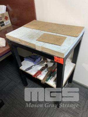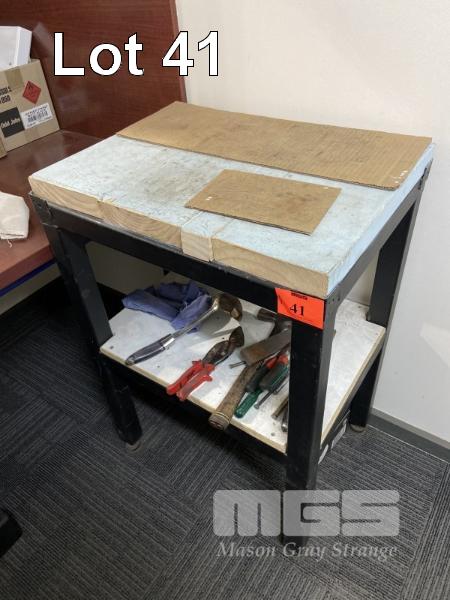 SMALL WORK BENCH, 600 x 400mm TIMBER TOP, HEAVY DUTY STEEL FRAME WITH TOOLS