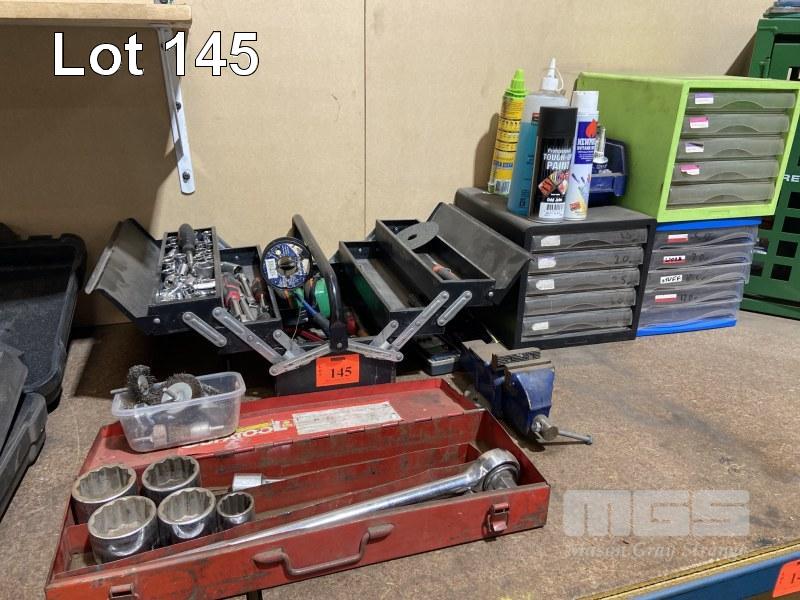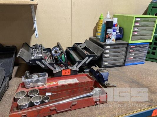TOOL BOX & CONTENTS SOCKETS, SPANNERS, SMALL VICE, ETC.