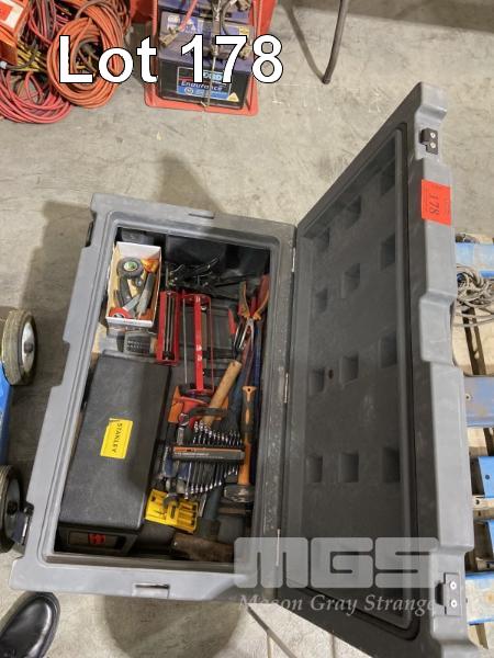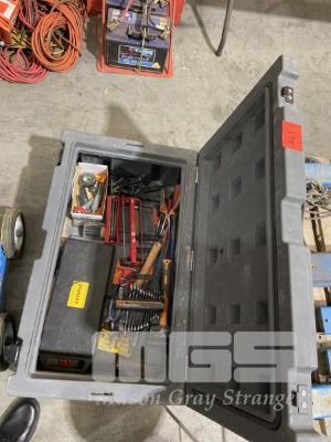 PLASTIC TOOL BOX 900 x 500mm & TOOLS SPANNERS, S/D SET, SLEDGE HAMMERS PLIERS, BIT SET & MORE