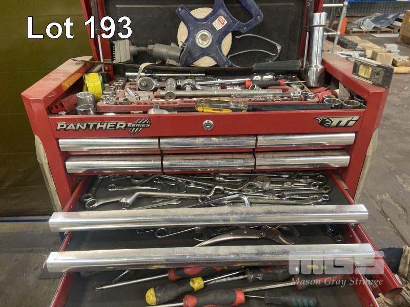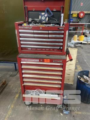 PANTHER TOOL BOX, 9 DRAWER ON SIDCHROME 7 DRAWER TOOL TROLLEY COMPLETE WITH TOOLS SOCKETS, METRIC/AF SPANNERS HEX KEY, SCREW DRIVERS, BIT SETS CHISELS, HACKSAW, SPECIALTY BITS & MORE (A GREAT LOT)