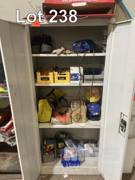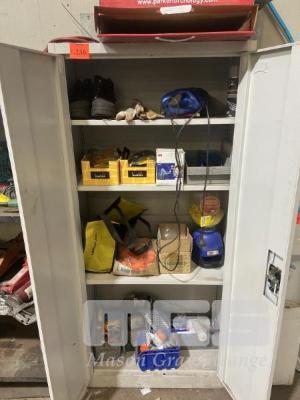 STEEL 2 DOOR CUPBOARD & CONTENTS SAFETY GLASSES, RESPIRATOR FILTERS EAR PLUGS, SAFETY BOOTS AIR FITTINGS & ELEC PLUGS