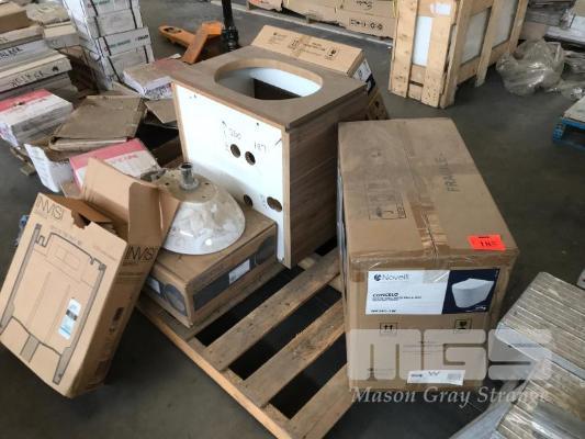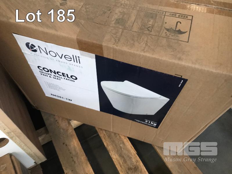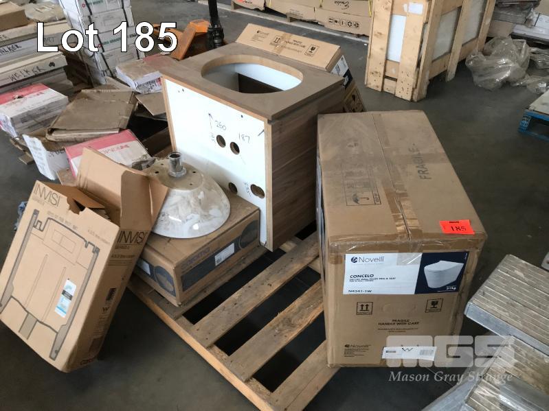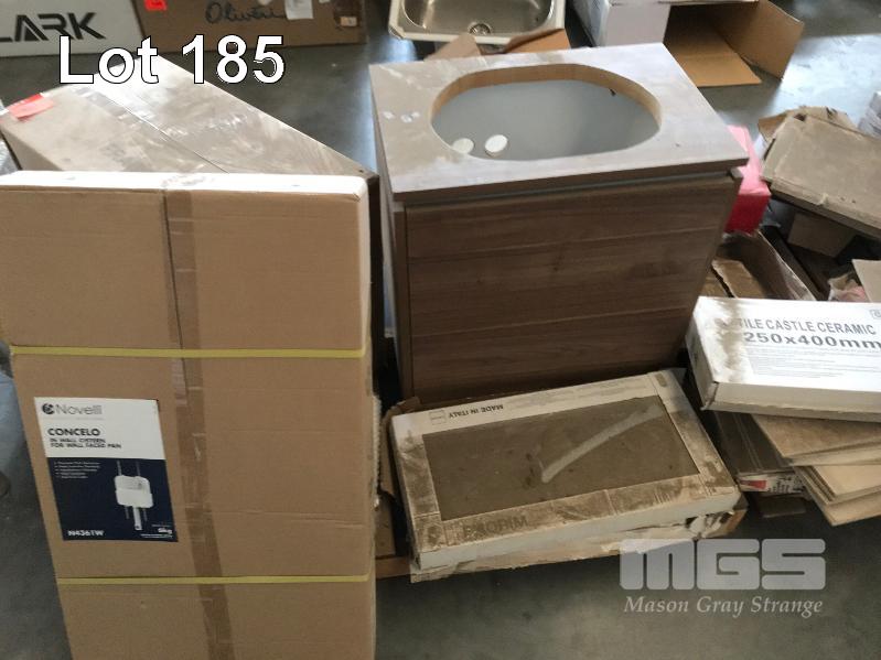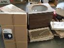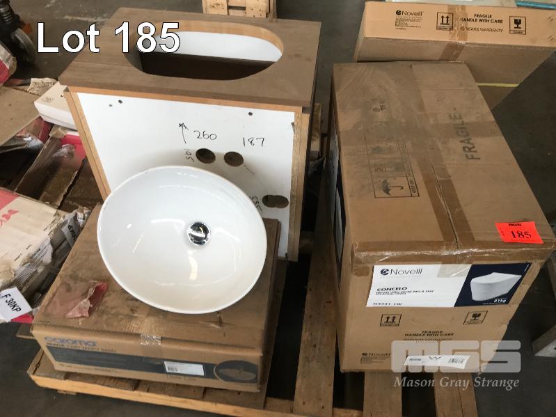 COMPLETE BATHROOM SUITE COMPRISING NOVELLI CONCELO TOILET PAN & CONCEALLED CISTERN, WOODGRAIN LAMINATE VANITY WITH ABOVE COUNTER BASIN SPLASHBACK TILES ETC