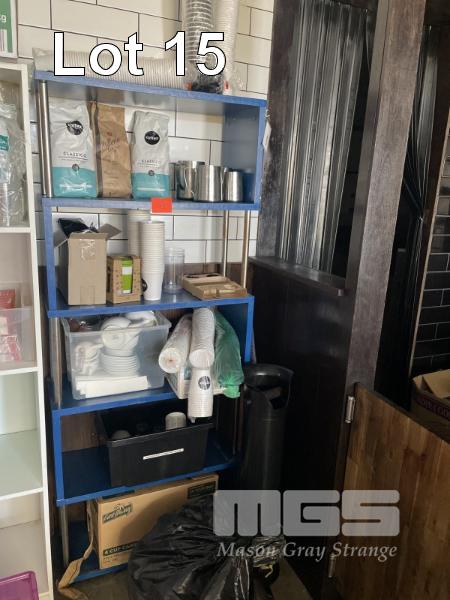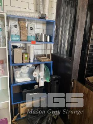 COFFEE BEANS, (SOME EXPIRED 22), GRINDS WASTE KNOCK TUBE, STAINLESS STEEL JUGS, TAKEAWAY CUPS, LIDS & CARRY TRAYS, TEA POTS, CUPS, SAUCERS & BLUE SHELF